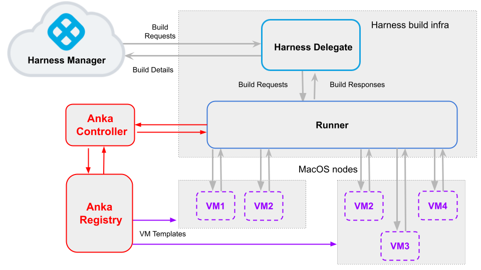 The following diagram illustrates how Harness CI and Anka work together. The Harness Delegate communicates directly with your Harness instance. The VM runner maintains a pool of VMs for running builds. When the delegate receives a build request, it forwards the request to the runner, which runs the build on an available VM. The Anka registry and controller orchestrate and maintain the Mac VMs. Once you set up the Harness and Anka components, you can scale up your build farm with additional templates, build nodes, and VMs.