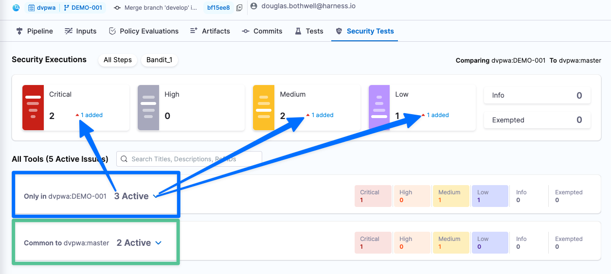 DEMO-001 has 5 security issues: 2 critical, 2 medium, 1 low. Note that 3 of these issues are in the DEMO-001 branch only and 2 are common to both DEMO-001 and master.