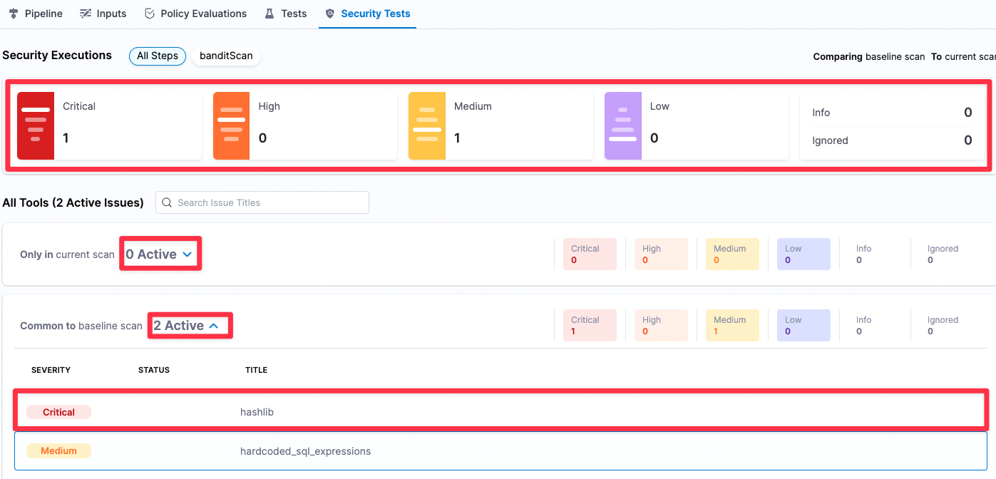 In the following step, you'll create an exemption for each of the two critical issues found: subprocess_popen_with_shell_equals_true (only in the current scan) and hashlib (common to the baseline scan).