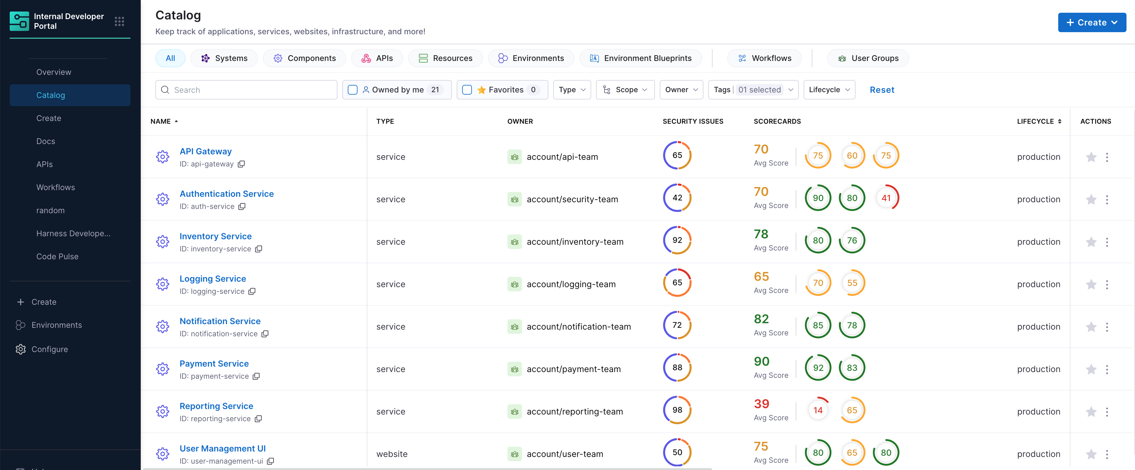 • Catalog View: High-level vulnerability indicators for all services.